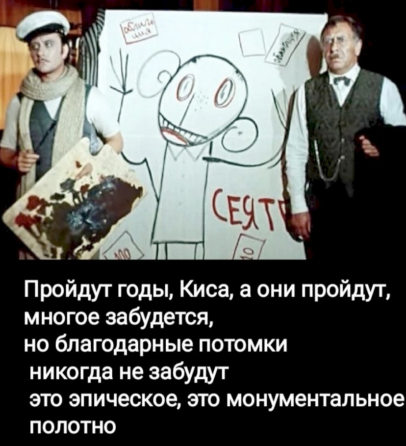 На изображении представлена сцена с двумя мужчинами, стоящими перед большим холстом, на котором изображена примитивная картина с человеческой фигурой и надписями. Первый мужчина слева, одет в белую рубашку и серый жилет, поверх которого намотан шарф, держит палитру с красками. Второй мужчина, стоящий справа, носит классический костюм с жилетом, они оба выглядят достаточно серьезно. Холст включает в себя нарисованное фигуративное изображение с большими красными глазами и надписью "Сеять". Фон немного затемнен, создавая впечатление небольшого студийного освещения. Внизу изображения располагается текст: "Пройдут годы, Киса, а они пройдут, многое забудется, но благодарные потомки никогда не забудут это эпическое, это монументальное полотно", придающий сцене ироничный и, возможно, сатирический оттенок.