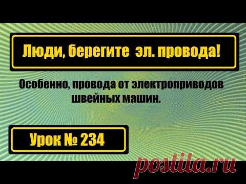 Это изображение представляет собой предупреждающий плакат с акцентом на безопасность электрических проводов, особенно тех, которые используются для электроприводов швейных машин. Фон плаката имеет спиралевидный узор, создающий иллюзию глубины и динамичности, выполненный в зеленовато-желтых оттенках, добавляющих яркости и привлечению внимания. Основной текст на плакате выделен желтым цветом на черном фоне, что делает его ярким и контрастным. Слова написаны жирным шрифтом, а сам текст обращен к людям с просьбой бережно относиться к электропроводам. Каждый элемент композиции поддерживает цель наведения фокуса на сообщение о безопасности. В нижней части изображения выделен еще один элемент с надписью "Урок №234", который, возможно, указывает на последовательность или серию подобных предупреждений. Использование черно-желтых цветовых акцентов ассоциируется с безопасностью и предостережениями, напоминая дорожные знаки или промышленные указатели. В изображении заложено важное послание о необходимости соблюдения правил безопасного использования электрооборудования в быту и на рабочем месте. Общая атмосфера изображения серьезная и настраивает на размышления об осторожности и ответственности.