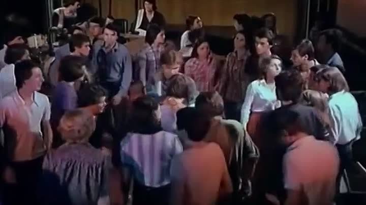 На изображении большая группа людей стоит в круге, создавая атмосферу неформального общения. Яркие огни мягко освещают пространство, добавляя теплые и уютные тона в сцену. Большинство людей одеты в повседневную одежду стиля 1970-х годов — рубашки с длинными рукавами, брюки и юбки. В их позах и жестах читается энергичное участие в происходящем, возможно, на танцевальном мероприятии. Видно, что участники увлеченно обсуждают что-то или слушают музыку. В центре композиции выделяются люди, активно жестикулирующие, показывающие проявления эмоций. Фон темный, создавая эффект сцены или зала для дискотек, подчеркивая атмосферу ретро. Современная графика или текстуры отсутствуют, что может указывать на ретроспективный сюжет. Цветовая гамма представляет собой сочетание теплых оттенков, с акцентами на темные и светлые тона, создавая визуальный баланс и глубину в изображении. Вокруг тянется атмосфера советской эпохи, что усиливает не только визуальные, но и эмоциональные ассоциации с классическими моментами советской культуры. ЭТА ПЕСНЯ СТАЛА КЛАССИКОЙ СОВЕТСКОЙ ЭСТРАДЫ! 👍 👍 👍, добавляя ностальгические нотки в общую композицию.