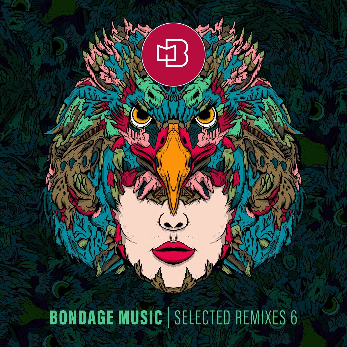 На ярком и динамичном изображении представлена стилизованная маска, совмещающая черты орла и человеческого лица. Верхняя часть лица маски напоминает голову орла с яркими и агрессивными глазами, окруженными голубыми и зелеными перьями. Нижняя часть изображает женское лицо с выразительными губами цвета фуксии. На фоне видны сложные узоры, напоминающие густую листву и создающие ощущение глубины и текстуры. Цветовая палитра богата сочетаниями ярко-синего, зеленого и красного. В верхней части маски размещен красный круг с белым символом, добавляющим элемент фирменной стилистики. Освещение равномерное, с акцентом на центральной фигуре, которая выступает на переднем плане. На изображении также имеются надписи, выполненные строгими шрифтами: "BONDAGE MUSIC" и "SELECTED REMIXES 6", расположенные в нижней части, которые придают композиции музыкальную тематичность. Атмосфера работы уникальна, сочетая модернистские элементы дизайна с традиционными мотивами масок, создавая ощущение креативности и куража.