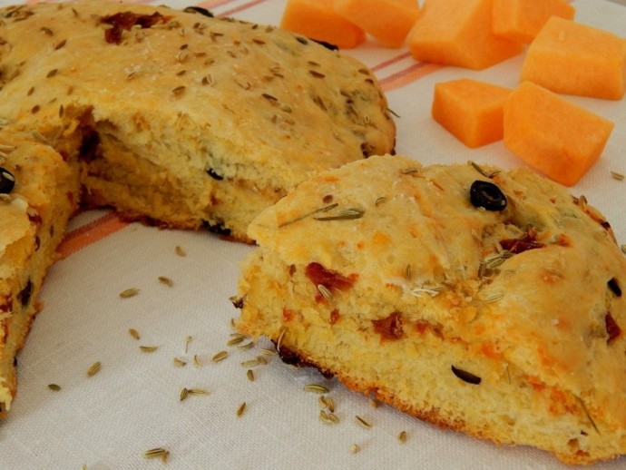 Тыквенный пирог с вялеными томатами Ингредиенты:Пюре тыквенное — 200 гВяленые томаты — 6 шт. Оливки — 4 ст. л. Мука — 400 г Дрожжи — 15 г Масло оливковое — 75 мл Розмарин (свежий) — 2 веточки Укроп (семена) — 2 ст. л. Вода — 150 мл Соль...