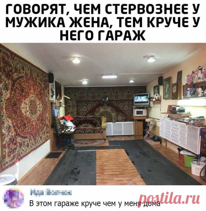 Изображение представляет собой гараж, оформленный в необычном уютном стиле. На переднем плане видно деревянное покрытие пола, по центру которого проложены две дорожки. На стенах висят ковры с традиционным восточным орнаментом, создавая атмосферу гостиной. В углу стоит небольшой телевизор, обогреватель и микроволновая печь, что делает пространство функциональным и комфортным для отдыха. Также на полках расположены различные бытовые предметы и книги, что добавляет экспрессию и уют. Освещение равномерное, с несколькими источниками света на потолке. Это придаёт помещению просторности и глубины. Рядом можно увидеть элемент декора в виде футбольного мяча. Надпись сверху содержит юмористическое утверждение относительно отношений и пространства гаража. Входит комментарий, который дополняет картину, утверждая, что этот гараж уютнее дома комментатора. Общая атмосфера наполнена иронией и домашним комфортом, превращая обычное пространство в зону отдыха.