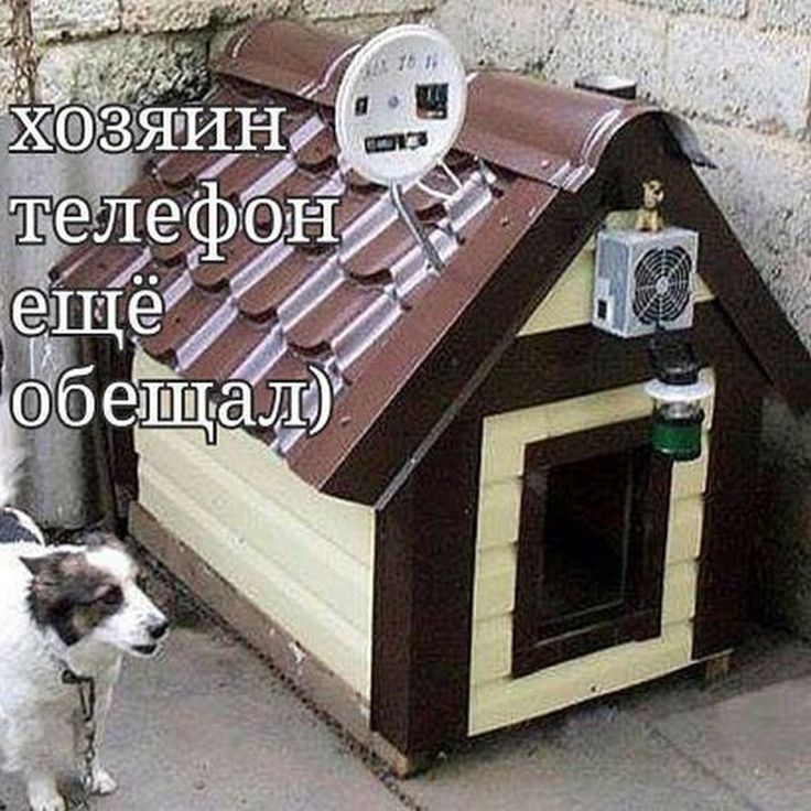 На изображении представлена причудливая будка для собаки, построенная с элементами современного комфорта. Будка выполнена из дерева и окрашена в кремовые и коричневые тона. Крыша имитирует металлические черепицы, а на ней установлен маленький спутниковый диск, что создаёт забавный контраст с традиционной конструкцией. Спереди прикреплен маленький кондиционер, а рядом с будкой стоит собака бело-черного цвета. Собака выглядит ожидательно, её голова слегка наклонена, словно она что-то ждёт. На переднем плане видна надпись: "хозяин телефон ещё обещал", создающая юмористическую атмосферу, связав сигнализацию с описанием. Свет на изображении естественный, освещающая сцена придаёт ей дневное освещение. На заднем плане видна стена из бетона, которая служит фоном для композиции.