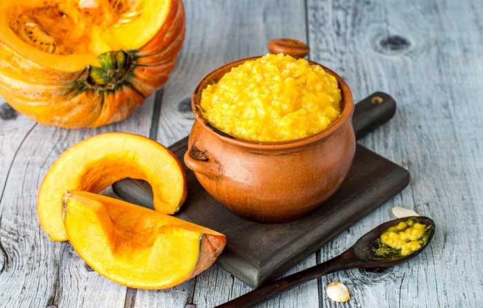 На изображении представлен традиционный деревянный стол, на котором размещен керамический горшок с аппетитной тыквенной кашей ярко-желтого цвета. Горшок имеет гладкую поверхность и насыщенный коричневый цвет, что гармонично сочетается с общим сельским стилем. Рядом с горшком лежат крупные кусочки свежей тыквы, ярко-оранжевой и сочной. На фоне можно заметить деревянную разделочную доску, которая дополняет атмосферу деревенского тепла и уюта. В левом нижнем углу стоит металлическая ложка, содержащая немного каши, подчеркивая её зернистую текстуру. Светлое, естественное освещение выделяет насыщенные цвета и текстуры ингредиентов, создавая ощущение свежести и простоты. Композиция изображения сосредоточена на центральных элементах, создавая ощущение глубины и наглядности. Визуальная гармония и простота линий подчеркивают домашний уют и традиционные мотивы, вызывая теплое чувство ностальгии и спокойствия.