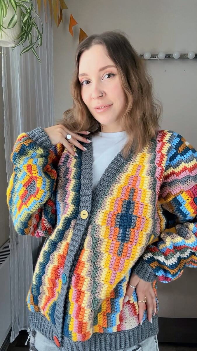 На изображении молодая женщина стоит в помещении, одетая в яркий вязанный кардиган с геометрическим узором, включающим цвета: желтый, синий, красный и серый. Волосы у нее распущены, светло-каштанового цвета. На руке у нее несколько колец, включая приметное кольцо с белым камнем. Она смотрит прямо в камеру с легкой улыбкой на лице. Светлая стена фоном создает уютную атмосферу, в углу висит горшок с зелеными растениями и декорацией в виде оранжевых флажков. Яркое светодиодное освещение делает изображение ярким и четким. Текст указывает на повседневные занятия и создает персональный и спокойный настрой, сопоставляя его с названием Ирина Маркелова.
