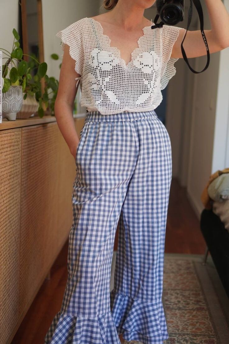 На изображении представлена женщина, делающая селфи с помощью зеркальной камеры. Она одета в белую вязаную крючком блузку с красивыми цветочными мотивами, выполненными в технике филейного вязания. Блузка отличается нежным и романтичным стилем благодаря ажурным рукавам. На ней также надеты широкие брюки в голубую и белую клетку с воланами. Эта одежда создаёт атмосферу летнего комфорта. Образ подчеркивает летнюю лёгкость и непринужденность, подходящую для теплого времени года. На заднем плане можно заметить деревянную мебель и зелёные растения, добавляющие природный акцент. Освещение на фотографии мягкое, дневное, создающее тёплое и гармоничное настроение. В углу изображены буквы "поситила.ру", что может указывать на тематическую принадлежность к вязанию. Общая композиция подчёркивает креативный подход к летней моде и рукоделию, что актуально для сезона 2025.