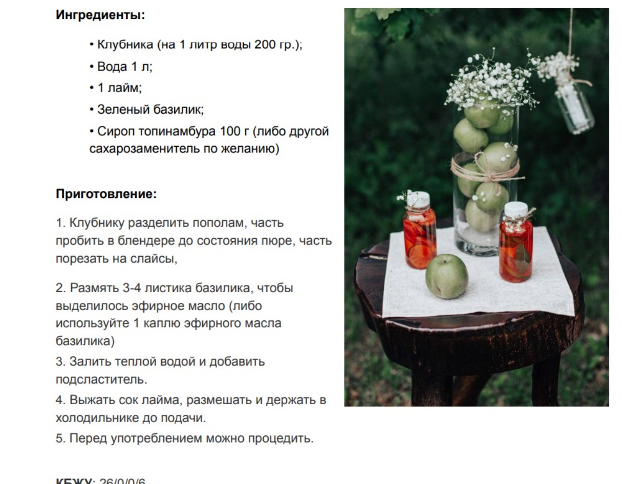 На изображении представлена страница с рецептами, на которой справа внизу находится метка времени "Скриншот-30-06-2025 11:35:37.jpg". Слева видим текст с ингредиентами и пошаговой инструкцией приготовления напитка. Среди ингредиентов отмечены клубника, вода, лайм, зеленый базилик и сироп топинамбура. Справа показан столик, на котором на белой салфетке стоит высокая прозрачная банка, заполненная зелеными фруктами и украшенная цветами. Рядом находятся две маленькие бутылочки с прозрачной красноватой жидкостью. На заднем плане зелёная растительность, создающая спокойную атмосферу. Композиционно изображение хорошо сбалансировано: текст занимает левую часть, в то время как правую занимает фотография с элементами природы и декора. Свет мягкий, естественный, подчеркивающий зелёные и красные оттенки на фото. Можно заметить элементы деревянной текстуры у столика и природные цветы в прозрачной ёмкости, что придает картине летний и свежий вид.