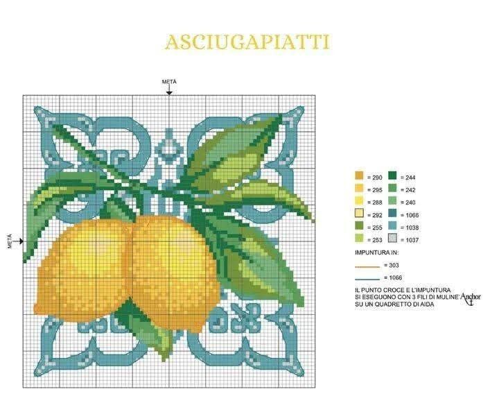 На изображении представлена схема для вышивки крестом, изображающая лимоны на фоне декоративного орнамента. Цветовая палитра включает ярко-жёлтые, зелёные и бирюзовые оттенки. Лимоны выполнены в насыщенных жёлтых тонах, выделяясь на фоне сочных зелёных листьев. Орнамент выполнен в бирюзовом цвете, обрамляя основной рисунок. В правой части схемы размещена таблица с номерами ниток и их цветами, указаны цифры от 290 до 1066. Название "ASCIUGAPIATTI" написано в верхней части изображения. В левом нижнем углу изображения текст "Пин на доске Punto de Cruz". Схема выполнена на сетке, характерной для дизайнов вышивки, с указанием "META". Схема уверенно передаёт средиземноморский мотив через использование цветовых акцентов и растительных элементов. В нижней правой части присутствуют инструкции на итальянском языке, касающиеся техник вышивки, с указанием бренда "Anchor". Общая композиция подразумевает декоративное оформление для интерьерного текстиля.