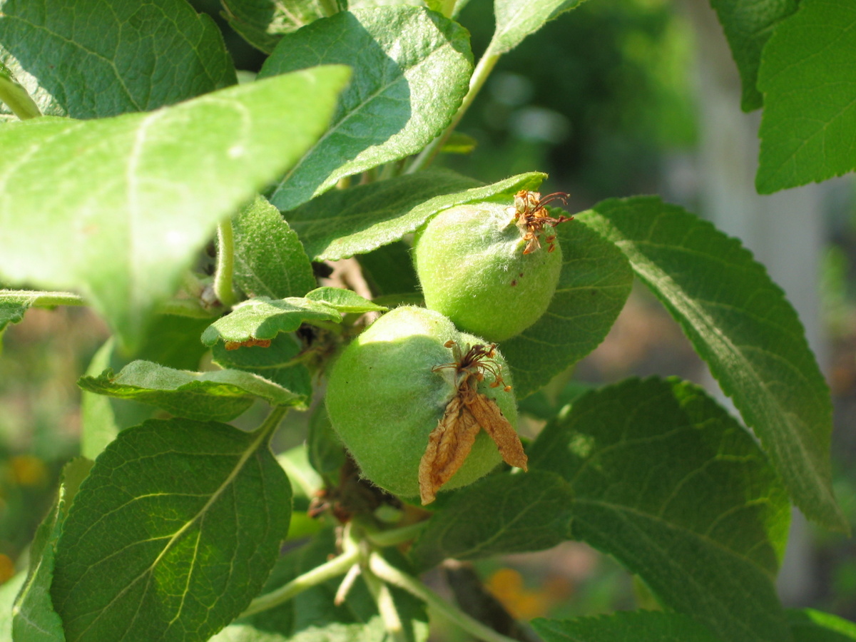 На изображении представлено дерево с зелеными листьями и маленькими, еще незрело сформировавшимися плодами. Листья насыщенного зеленого цвета, слегка глянцевые, с выраженными прожилками, придающими им текстуру. Плоды выглядят мелкими, округлыми и имеют светло-зеленый оттенок кожицы. На некоторых плодах видны коричневые цветковые остатки, характерные для начального этапа формирования фруктов. Свет равномерно распределен по изображению, подчеркивая детали в переднем плане. На заднем плане можно заметить размытые силуэты других растений. Это место очевидно благоприятное для садоводства, возможно, в контексте сада или огорода. Фото напоминает атмосферу умеренного летнего дня, когда солнце мягко освещает растения. Визуальной основой изображения является натуральная, органическая эстетика с акцентом на восхищение природой и стремлением ухаживать за растениями в летние месяцы. Ссылка на использование монофосфата калия может быть связана с плодородным сезоном июня-июля, позволяющим получить лучшее качество плодов.