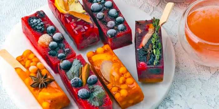 На изображении представлены замороженные фруктовые десерты, расположенные на белой тарелке. Аппетитные формы напоминают эскимо на палочке. Каждый десерт обрамляет яркие и насыщенные цвета: красный, оранжевый и фиолетовый, которые достигаются за счёт разнообразных свежих ягод и фруктов. В композиции можно увидеть голубику, ягоды облепихи, веточки мяты, звездчатый анис и кусочки персиков или груш. Некоторые из десертов украшены целой веткой тимьяна или долькой цитруса, добавляющей аромат и эстетическую привлекательность. На тарелке также видна чашка с напитком янтарного оттенка. В кадре присутствуют текстуры и детали, создающие ощущение свежести и естественности, акцентирующие внимание на сезонных продуктах. Освещение мягкое и приглушённое, создающее уютную атмосферу. Четкое внимание к деталям и композиции делает изображение привлекательным и тематически гармоничным.
