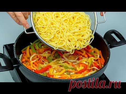 На изображении представлен процесс приготовления блюда на кухне. На переднем плане видно крупную черную сковороду с яркими нарезанными овощами – красный, зеленый, и желтый болгарский перец, а также морковь и лук. Яркие и насыщенные цвета овощей создают красочную композицию. В центре сковороды находящихся на плите, над ней, рука держит металлическое сито, из которого выкладываются вареные спагетти. Сито блестит на свету, добавляя элегантный контраст с матовой поверхностью сковороды. Плита черного цвета создает строгий и аккуратный фон, фокусируя внимание на процессе готовки. Рука в кадре ухоженная с аккуратным маникюром, что намекает на внимательность и заботу в процессе приготовления пищи. Общая атмосфера изображения теплая и домашняя, отражающая простоту и уют семейного ужина. Текст на изображении подчеркивает, что это рецепт из ресторана, который теперь стал домашним, подчеркивая уникальность и популярность блюда у семьи.