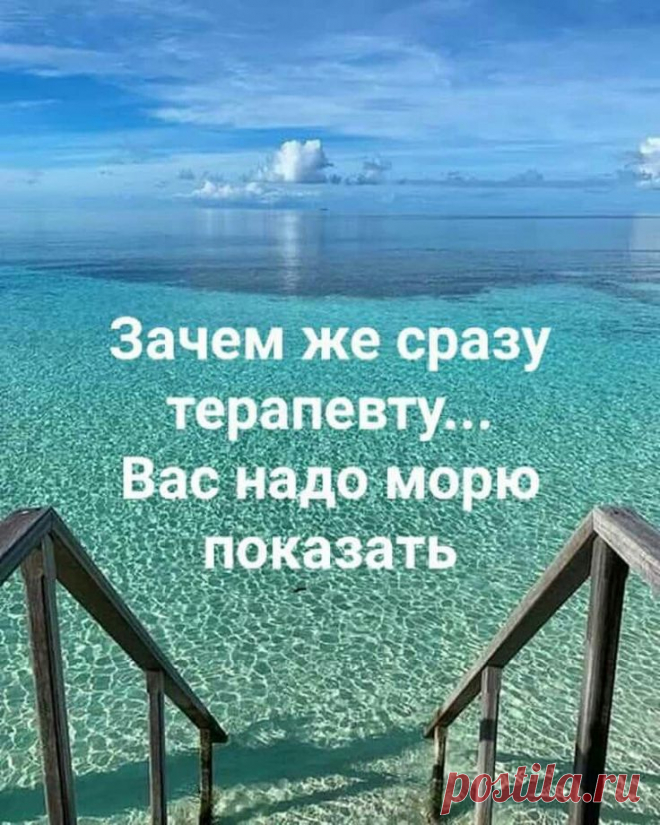 На изображении виден красивый пейзаж, где деревянные ступени ведут прямо в прозрачную бирюзовую воду моря. Кажется, что изображение снято с возвышения, позволяя наблюдать за водной гладью, которая отражает ясное голубое небо с легкими облаками. Вода настолько прозрачная, что можно рассмотреть рябь на дне, что придаёт сцене свежесть и спокойствие. В центре изображения размещён текст на русском языке: "Зачем же сразу терапевту... Вас надо морю показать". Это можно интерпретировать как приглашение к релаксации и восстановлению душевного равновесия на природе, символизируя терапевтический эффект моря. Композиция фокусирует внимание зрителя на ступенях и воде, создавая ощущение, будто вы находитесь на прорезиненном пешеходном мостике, ведущем в море. На изображении доминируют холодные тона синего, голубого, бирюзового и серого, создавая атмосферу прохлады и умиротворения.