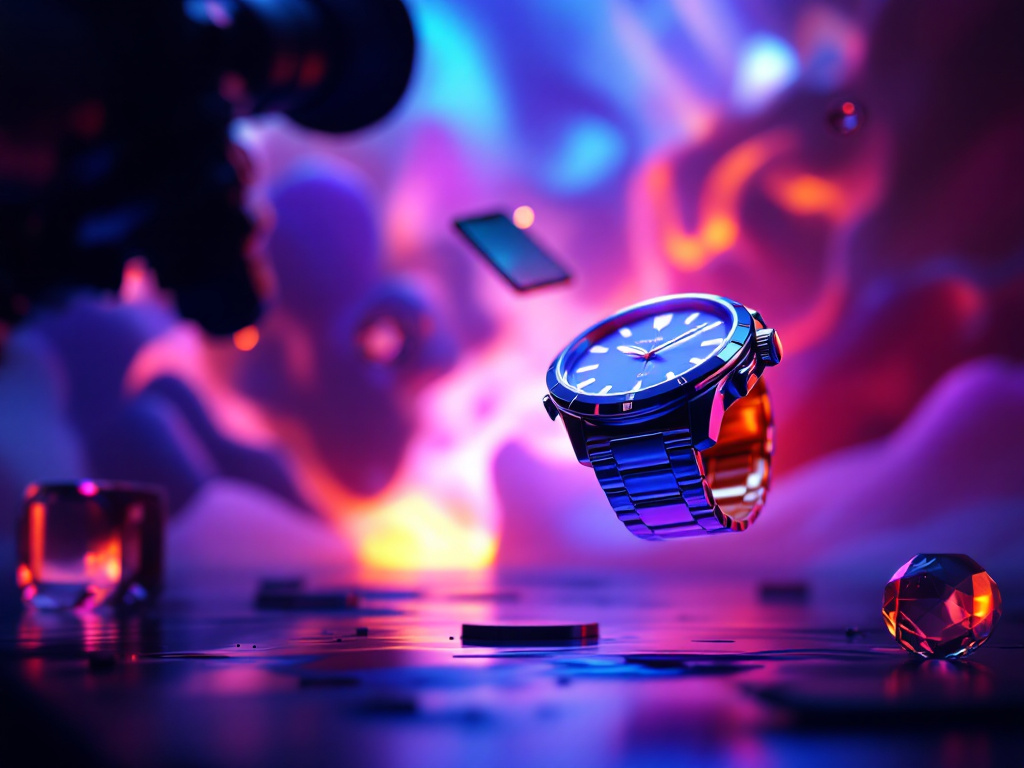 На изображении представлен захватывающий мир предметной фотографии, который переносит зрителя в футуристическую атмосферу с акцентом на металлические детали и технологии. На переднем плане изображены часы с металлическим браслетом, выполненные в прохладных оттенках синего и серебристого, отражающих свет и создающих ощущение роскоши и функциональности. Часы как бы парят в воздухе, что добавляет динамичности и инновационности всему кадру. Вокруг видны абстрактные формы и элементы, возможно, частицы света или цифровых эффектов, которые усиливают впечатление загадочной глубины. Композиция дополнена яркими, насыщенными фиолетовыми и розовыми оттенками, которые создают пленительный контраст, привлекающий взгляды. В подсветке присутствуют неоновые акценты, создающие эффект космического пространства или виртуальной реальности. Помимо этого, текстура поверхности, где расположены часы, придаёт изображению дополнительное измерение благодаря блестящим бокам и плавным краям. Данная сцена вдохновляет на размышления о развитии технологий, в особенности в контексте нативной рекламы, и способах демонстрации изделий, таких как вязаные кардиганы или иные предметы искусства и рукоделия, через призму современности и прогресса.
