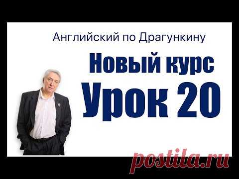 На изображении представлен пожилой мужчина, одетый в классический темный костюм и белую рубашку. Он располагается с левой стороны изображения, расслабленно засунув руки в карманы, выражение лица спокойное и доброжелательное. На изображении присутствует текст на русском языке: "Английский по Драгункину Новый курс Урок 20", написанный крупным и жирным шрифтом синего цвета. Фон изображения белый, что создает контраст с темной одеждой мужчины и синим текстом. В правом нижнем углу изображена надпись красного цвета. Освещение равномерное, придавая изображению официальность и образовательный контекст. Композиция сбалансирована, текст располагается справа, занимая большую часть изображения, акцентируя внимание на информации о новом курсе урока. Поза мужчины и его выражение лица передают уверенность и профессионализм, что соответствует образовательной тематике изображения.