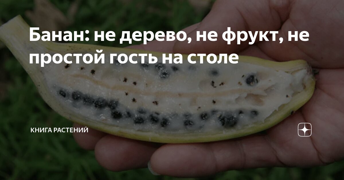 На изображении крупным планом представлена рука, держащая половинку банана. Банан разрезан вдоль, обнажая внутреннюю мякоть и множество черных семечек, что является необычным видом для привычного банана. Кожура банана имеет зеленовато-желтый оттенок, а мякоть слегка кремового цвета. Рука человека с ровными пальцами показывает жест спокойствия и уверенности, он аккуратно держит плод. Фон размытый, на нем виднеется зелёная трава, создавая контраст с яркостью плода. Освещение естественное, без резких теней, что указывает на дневное время. Текст, расположенный на изображении, обращает внимание зрителя на интересные особенности банана, подчеркивая его нетипичность в привычной фруктовой категории, подразумевая, что о растении идёт речь в статье автора «Книга растений» в Дзене.