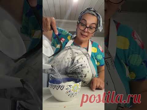 На изображении представлена женщина в яркой футболке с разноцветными узорами, состоящими из кругов и полос. На ней также надет фартук с черно-белым геометрическим рисунком. У женщины на голове повязан полосатый платок, а на лице большие очки круглой формы. Она находится на кухне, освещенной мягким светом, который создает уютную атмосферу. Женщина держит в руках белый электрический чайник, из которого выливает кипящую воду в белую керамическую чашку с цветочным орнаментом и синей внутренней частью. На фоне виден светлый потолок с панелями, что подчеркивает уют сельской или дачной кухни. Женщина смотрит на чашку с вниманием и интересом, создавая впечатление, что она увлечена тем, что делает. На изображении также использован текст, который дополняет общее впечатление, создавая представление о быстроте и простоте выполнения кулинарного действия.