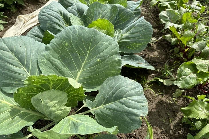 На изображении показана грядка с зелеными растениями, вероятнее всего капустой, в сельском огороде. Крупные, мясистые листья капусты имеют насыщенный зеленый цвет с характерной текстурой и прожилками. Они занимают большую часть переднего плана. На заднем плане также видны другие растения с более мелкими листьями, предположительно свекла. Земля между грядками выглядит влажной, что может быть следствием недавнего дождя. Освещение солнечное, что подчеркивает свежесть растений и их яркие цвета. Красный текст на картинке добавляет визуальный акцент. Изображение вызывает ощущения лета, роста и заботы о саде. Наличие влажной почвы и свежего воздуха может создавать идеальные условия для вредителей, если не принять меры для защиты посадок. Сцена выглядит уравновешенной и естественной, передавая атмосферу ухоженности и плодородия.