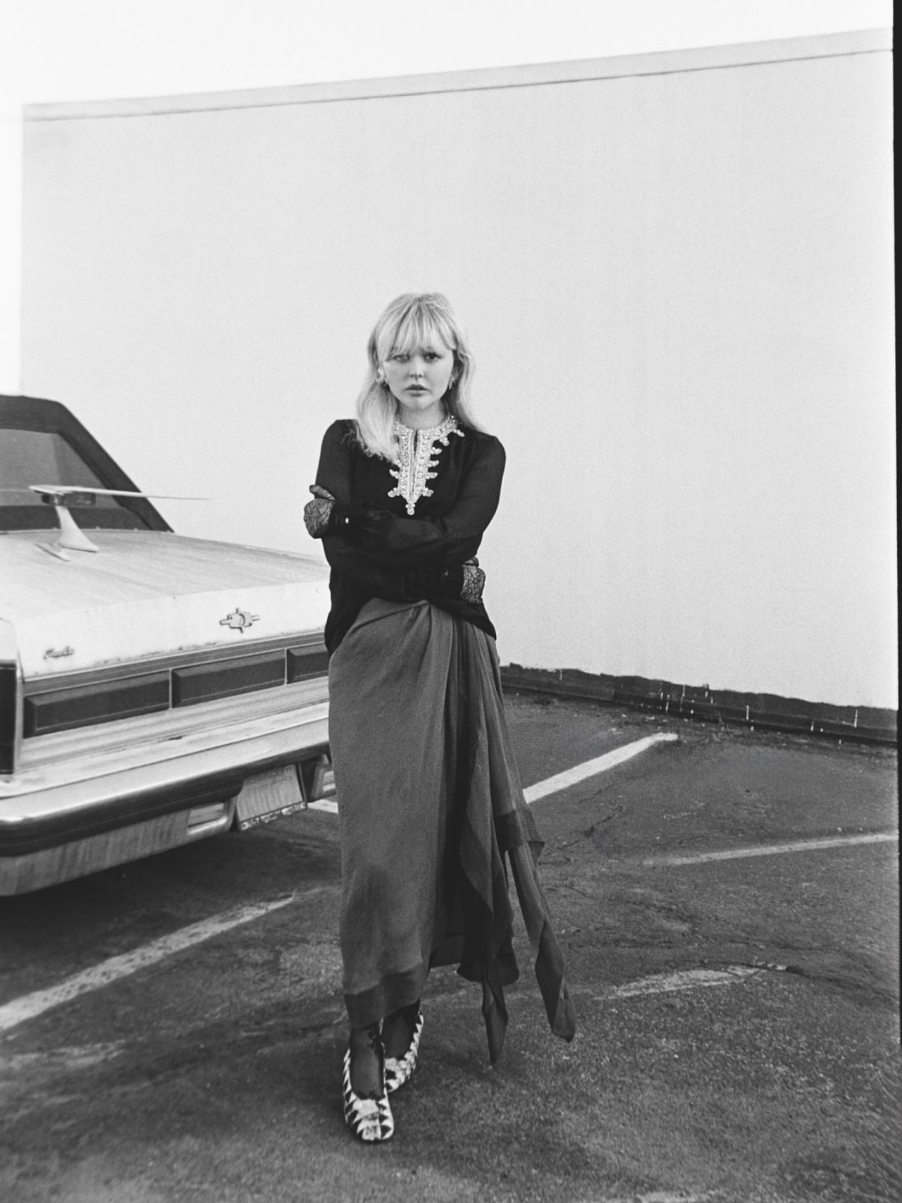 Черно-белая фотография изображает женщину со светлыми волосами, стоящую на парковке рядом с автомобилем классического дизайна, возможно, из 1970-х годов. Она одета в длинную юбку и темную блузку с орнаментальной вышивкой спереди. На ногах обувь с узором "зебра", что добавляет эксцентричности ее облику. Женщина сложила руки на груди, выражая уверенность и независимость. Её лицо серьезное, с легкой отстраненностью, взгляд направлен прямо на камеру, что создает эффект прямого контакта с зрителем. Автомобиль, расположенный на заднем плане, лишь частично входит в кадр, его боковая часть и эмблема видны. Фон достигается за счет ровной, возможно бетонной, стены. Освещение естественное, тени отсутствуют, что указывает на пасмурную погоду или рассеянный свет. Композиция снимка акцентирована на центральной фигуре, создавая ощущение ретро атмосферы городской среды. Отсутствие ярких визуальных акцентов способствует сосредоточению внимания на эстетике и стилистике десятилетия. Подборка фотосессий звезд и знаменитостей 01.07.2025 подчеркивает актуальность представленного образа и его связь с культурной иконографией.