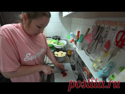 На изображении женщина в розовой футболке с надписью "Everything" готовит на современной кухне. Она нарезает небольшие красные кусочки, предположительно из овощей или фруктов, на белой пластиковой доске. Вокруг её рабочей зоны расположены различные кухонные принадлежности, в том числе цветные пластиковые контейнеры для хранения, металлические ложки и лопатки, а также стеклянная чаша, полная нарезанных ингредиентов. Слева можно заметить несколько зелёных листьев салата в миске, а также нарезанные яблоки. Освещение мягкое, свет падает сверху, создавая уютную атмосферу. Женщина сконцентрирована на процессе, слегка наклонилась над доской, держит нож с уверенностью в руках. Фон изображает типичную кухню с белыми плитками на стенах и металлическим раковиной, создавая ощущение порядка и чистоты. Видно, что она готовит простое и вкусное блюдо из овощей с мясом, возможно, используя рисоварку для приготовления, что соответствует надписи "Готовим вкусняшку/овощи с мясом в рисоварке/Просто и вкусно". Эта сцена напоминает традиционный домашний процесс приготовления, наполненный теплом и заботой.