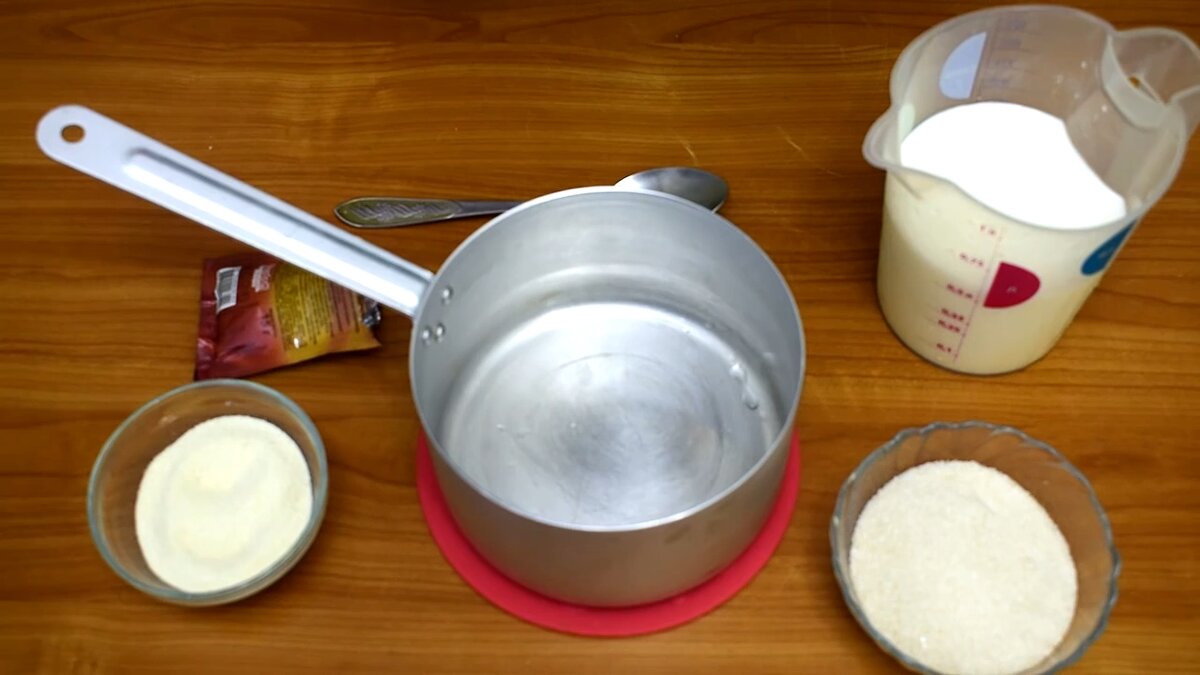 На изображении представлен деревянный кухонный стол в тёплом коричневом оттенке. На столе расположены три стеклянные миски, кастрюля и мерный стакан. В первой миске находится сахар, его крупинки ярко выделяются под светом. Вторая миска наполнена манной крупой, главным ингредиентом для приготовления нежнейшего крема из манной каши. Рядом располагается серебристая кастрюля с длинной ручкой на красной подставке, она пустая и ожидает своей очереди для использования. За кастрюлей находится ложка, её матовая поверхность блестит при ярком освещении. Справа расположился прозрачный мерный стакан с отметками, заполненный молоком, слегка пенящимся на поверхности. На заднем плане лежит пакетик неизвестного ингредиента тёмного цвета. Уровень освещения равномерный, подчёркивающий текстуры материалов. Весь композиционный акцент сделан на ингредиентах и кухонной утвари, создавая уютную атмосферу приготовления пищи дома.