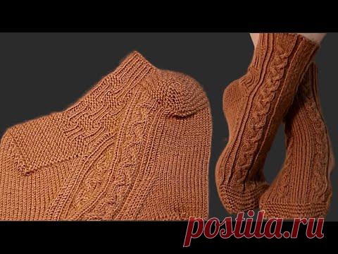 На изображении представлены два вида коричневых вязаных носков, выполненных спицами. Эти носки имеют сложный узор с элементами кос и жгутов, созданный из толстой пряжи, что придаёт им объём и текстуру. Наблюдая крупным планом, можно заметить чёткую детализацию вязки, особенно на манжете и подъёме. Приятный коричневый оттенок ассоциируется с тёплыми и уютными вещами. Носки выглядят прочными и подходят для холодных сезонов. Фон изображения тёмный, чтобы лучше выделить детальный узор. Световое освещение умеренное, что позволяет акцентировать внимание на сложных линиях и текстурах. Композиция изображения выделяет работу мастера, демонстрируя высокий уровень мастерства в вязании, что создаёт ощущение уюта и тепла. Текстильные изделия напоминают о традиционном рукоделии и могут быть частью современного или ретро-стиля одежды. В контексте приведённого рядом с изображением текста "Универсальные носки спицами. #(2025)", намекается на возможность использования данной модели как универсального решения для многих ситуаций.