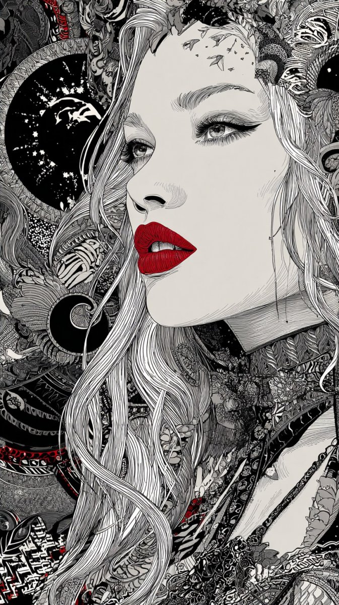 Загадочная красавица в черном и белом с яркими акцентами. Изображение из нейросети Миджорни - Midjourney примеры промтов - Форум ИИ о нейросетях - Yes Ai