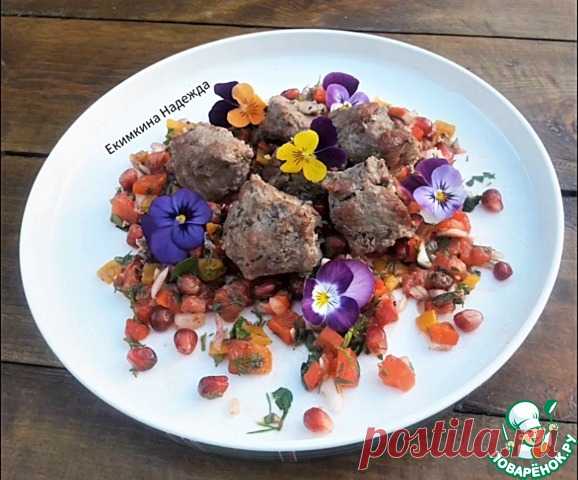 - Для шашлыка выбираем мякоть говядины. Мясо порезать кубиком 2х2 см. Готовим маринад для мяса. Репчатый лук очистить, порезать и проблендерить. Специи перемолоть в ступке. Лук отжать от сока. Сок смешать с молотыми специями. Мясо поместить в емкость, добавить сок лука со специями, перемешать. Добавить масло и газированную воду. Накрыть пленкой и мариновать не меньше двух часов, а лучше ночь. Периодически перемешивать мясо. Взять иголку с х/б нитью и нанизать на нить каждый кусочек мяса. Тем временем тандыр уже разогревается, мясо нанизывается. Этажерку для тандыра надо застелить фольгой, уложить мясо на нитке. Из разогретого тандыра убрать угли. Поставить этажерку в тандыр. Готовить 25 минут. К шашлыку я приготовила салат из печеных овощей, который идеально подходит к шашлыку. Шашлык получился сочный, с легкой румяной корочкой. Пальчики оближешь! Выложить на блюдо для подачи салат, на него шашлык. Для большего восторга можно украсить блюдо съедобными цветами. Ну просто домашний ресторан на даче! У кого нет тандыра — шашлык можно приготовить в духовке. Принцип тот же, так же будет вкусно!