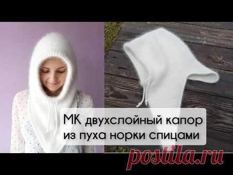 МК двойной зимний капор из пуха норки спицами с большим треугольным снудом