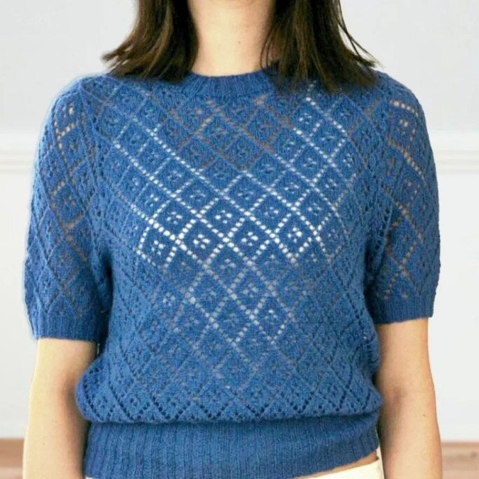 Синий пуловер с мелкими ромбами и коротким рукавом