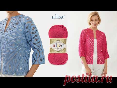 Кардиган с ромбовидным мотивом и шестиугольником с пряжей Alize Diva и Alize Cotton Gold