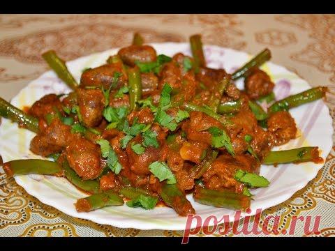 Куриные сердечки со стручковой фасолью в томатном соусе.Тушеные куриные сердечки.