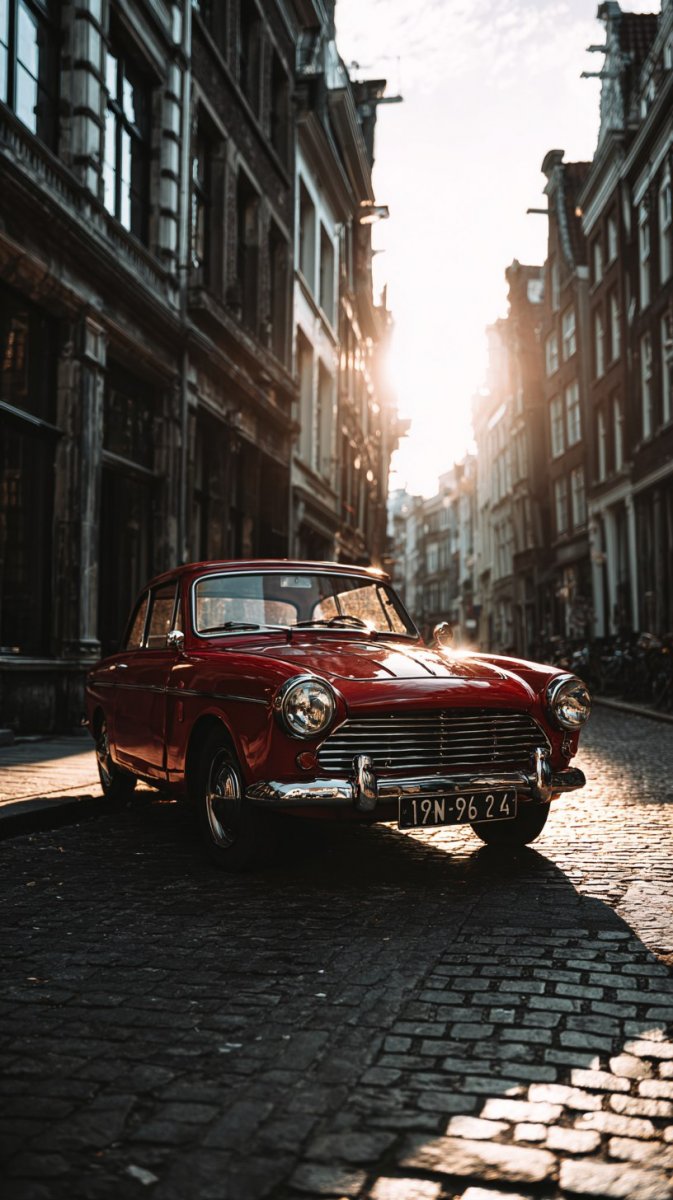 Винтажный автомобиль на старинной улице в лучах солнца. Генерация из нейросети Миджорни - Midjourney примеры промтов - Форум ИИ о нейросетях - Yes Ai