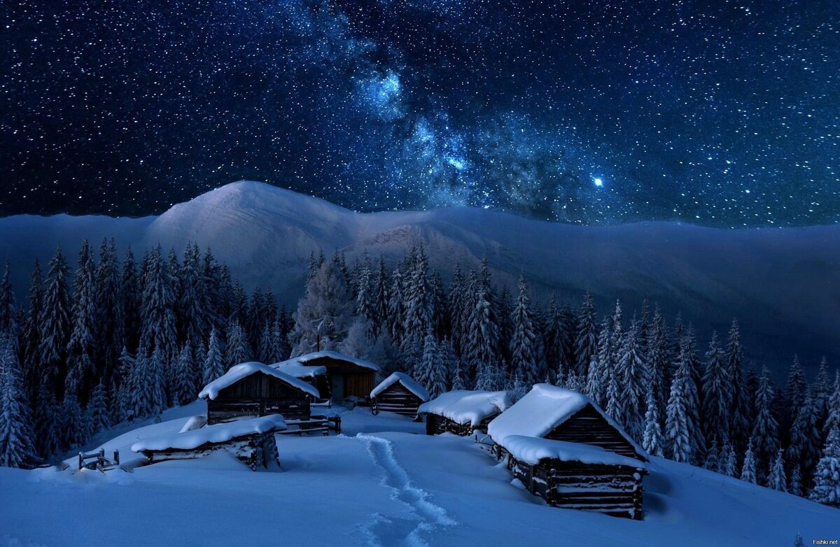 Звездное небо словно живописное полотно, растянувшееся над заснеженными склонами гор, где снежные тропы ведут к забытым временем хижинам, укрытым под тяжестью ночи. Кружащиеся на ветру хлопья снега рассказывают шепотом о прошлых жителях этих мест. Свет далекой галактики мечется между елями, как отблеск затихающих костров, оставляя на снегу призрачные тени воспоминаний. Этот мир словно обернут в бархатную тишину, где каждый звук — лишь эхо звенящей пустоты. Поверх всего этого висит надпись, как если бы сама природа попыталась указать на нечто невыразимо важное и неохватное, вплетая человеческую реальность в вечное великолепие. Здесь буквы танцуют, как отголоски ушедших слов, растворяясь в звездной гуще.