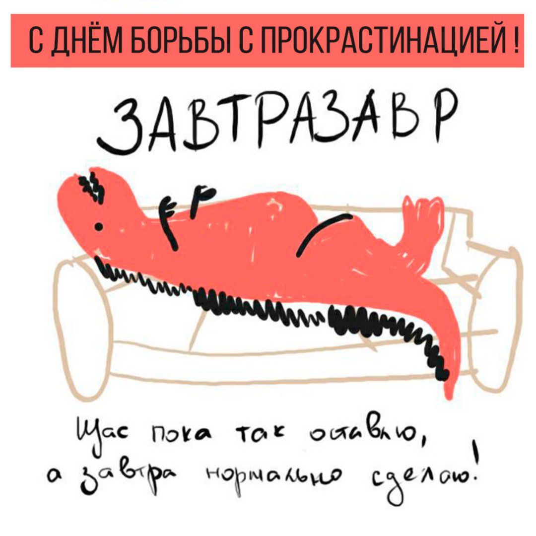 В свете неоновых ламп просторной гостиной разлегся могущественный Завтразавр — ленивая мечта каждого, кто хотя бы раз поддался магии прокрастинации. Он, растянувшись на старом диване, кажется безмятежнее древней рептилии, утопающей в аду повседневного бытия. Красные бока его блестят, словно воплощение бездействия, а эффектная подпись напоминает каждому: "С днём борьбы с прокрастинацией!" — иронию и трагедию, сливающиеся в одну мелодию жизни. Поджарив завтрак, он в будущем, безмятежно погружённый в идею сделать что-то завтра, внимает шёпотам обыденности: "Сейчас пока так оставлю, а завтра нормально сделаю!" Но каждый день превращается в маленькую одиссею, где главная роль отведена не действию, а мечтам о нём, гармонии томного безразличия. У него нет ни спешки, ни тревожных мыслей — лишь спокойное осознание собственной усталости. Этот абсурдный герой современности поражает невидимой силой, побуждает к размышлениям о ценности времени и пространства. Так ли важна эта битва, или мы просто танцуем под однообразные ритмы будней, ставших неизменной частью нас самих?