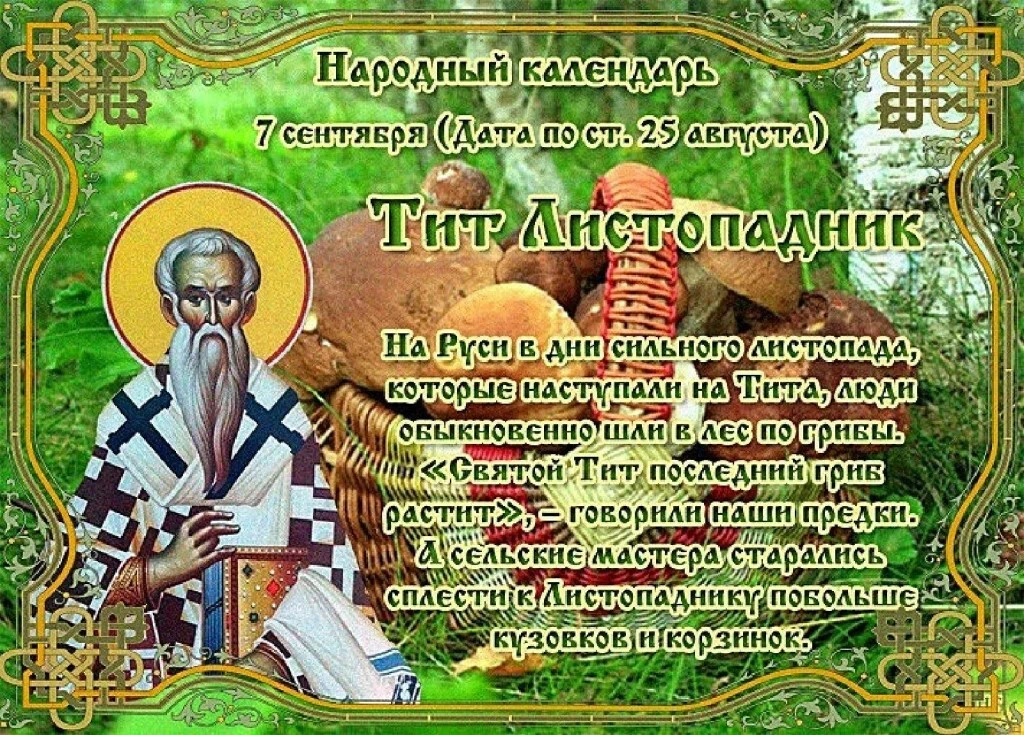 Тит Листопадник. В этот день в народе начинается активный сбор грибов, заканчивается сбор груш и рябины, и наблюдается, как опадают первые листья с деревьев.