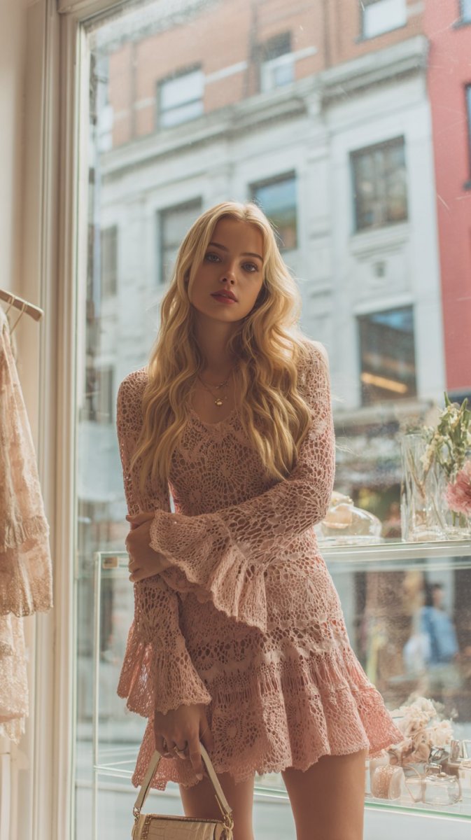 Нежный образ: вязаное платье и городская элегантность. Изображение из нейросети Миджорни - Midjourney примеры промтов - Форум ИИ о нейросетях - Yes Ai