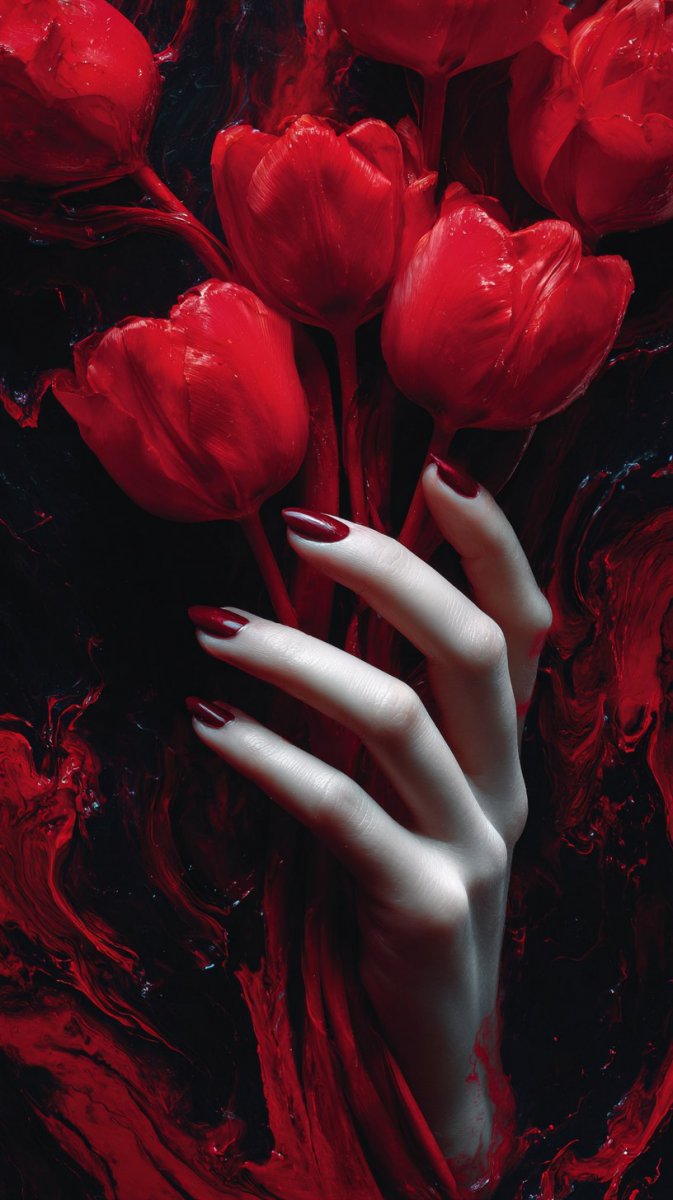 Рука и алые тюльпаны: танец цвета и движения в глубокой тени. Генерация из нейросети Миджорни - Midjourney примеры промтов - Форум ИИ о нейросетях - Yes Ai