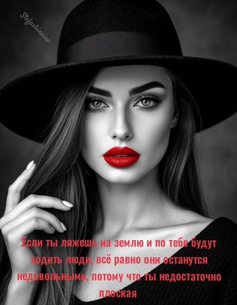 Вся композиция немецкоклассического портрета облекает её в ауру загадочности — словно из мира черно-белого кино, в котором плавно ходит только одно яркое пятно — её губы. Взгляд, пробившийся сквозь объектив, точно кинжалы режет невидимые преграды, частью которых стало слово, намеком на парадокс человеческой природы. Она смотрит на зрителя, на отражение времени, говорящая в тишине вселенной голосом вековой мудрости. Лаконичность шляпы, броские брови — всё это вместе напоминает о недостижимости идеала, а в глубине её глаз прячется философия — уйти с пути осуждения и стать единой с землей. Рядом с этим глубоким образом, текст звучит почти как исповедь: "Если ты ляжешь на землю и по тебе будут ходить люди, всё равно они останутся недовольными, потому что ты недостаточно плоская". Это не просто вызов, а скорее приглашение в мир, где каждой личности позволено иметь собственную глубину, и где недовольство общества лишь теневое отражение внутреннего мира каждого из нас.