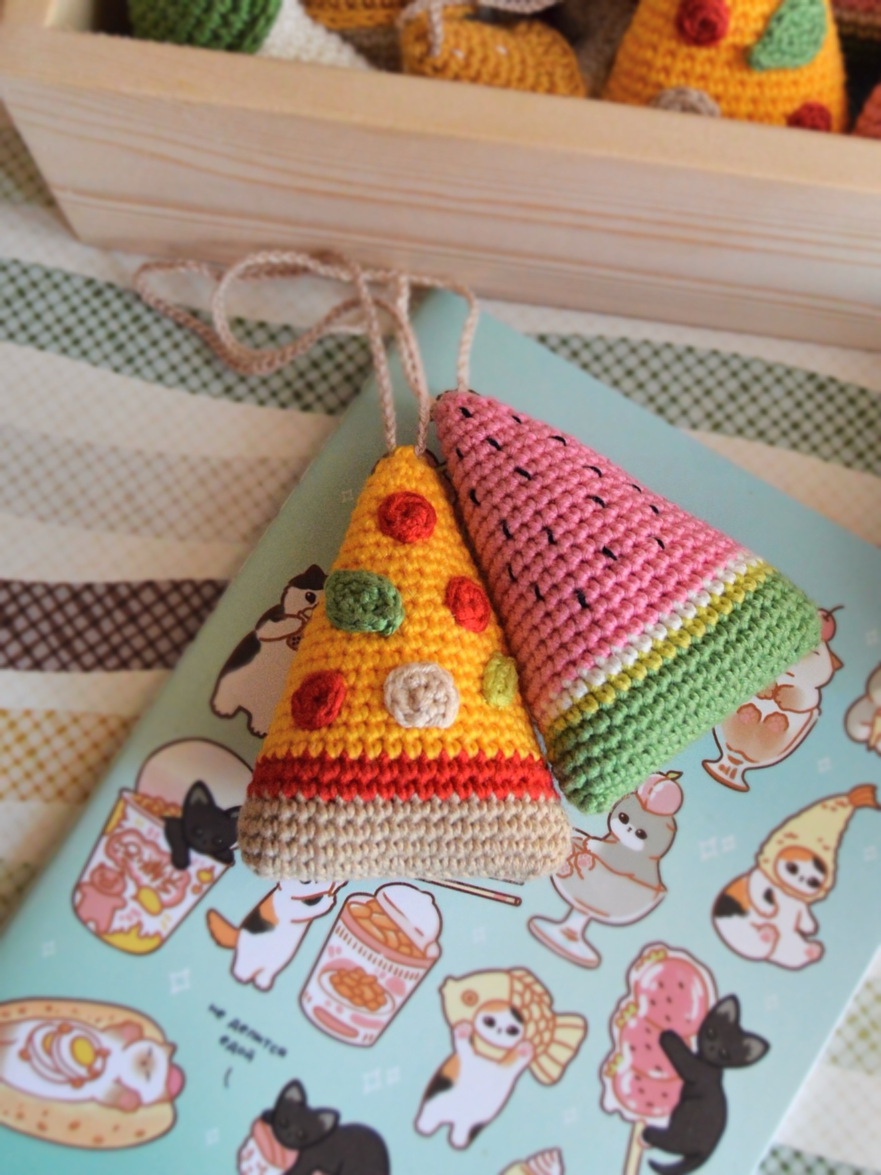 PDF Брелочки крючком. FREE crochet pattern; Аmigurumi toy patterns. Амигуруми схемы и описания на русском. Вязаные игрушки и поделки своими руками #amimore - маленькая долька арбуза из обычной пряжи, брелок в виде арбузной дольки и кусочка пиццы.