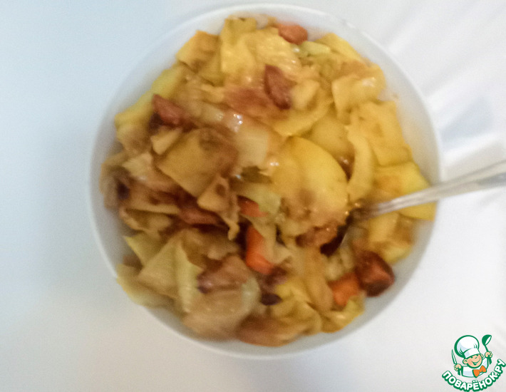 - В казане разогрейте масло и добавьте лук и морковь Готовьте, помешивая минут 5. Добавьте капусту и готовьте 20 минут, регулярно помешивая до равномерного прогрева, избегая подгорания. Наконец, добавить нарезанный тонкими слайсами картофель, чеснок, соль и куркуму. Накрыть крышкой и готовить на медленном огне 20 минут до готовности картофеля и до того, как масло уйдет на дно (что всегда можно проверить). Разложить по блюдам. Можно подавать Приятного аппетита.