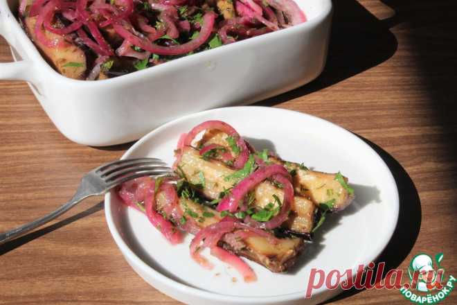- Баклажаны нарезать дольками. Если баклажаны мини, то просто пополам. В форму для запекания влить масло, добавить орегано, перемешать. Обвалять дольки баклажанов в масле со специями. Выложить баклажаны кожицей вниз. Духовка разогрета на 250. Я отдельно обваляла баклажаны в масле со специями и выложила их на пергамент. Готовить баклажаны до золотистого цвета. У меня это 15 минут - духовка газовая, нагрев снизу, ставила на вернюю полку. Лук порезать перьями (я полукольцами) и выложить в чашу. У меня лук не сладкий, поэтому добавила щепотку сахара и помяла лук. Влить уксус. Выдавить чуснок. Добавить соль. Добавить оливковое масло и перемешать. Достать баклажаны и выложить их в маринад - я выкладывала в два слоя, пересыпая луком, сверху полила маринадом, посыпала зеленью. Закрыть крышкой. Оставить на столе на 2 часа. Я пару раз встряхивала чашу. Посыпать еще раз зеленью перед подачей. Мне больше нравятся из холодильника, поэтому убрала на ночь в холодильник. Это очень вкусно!