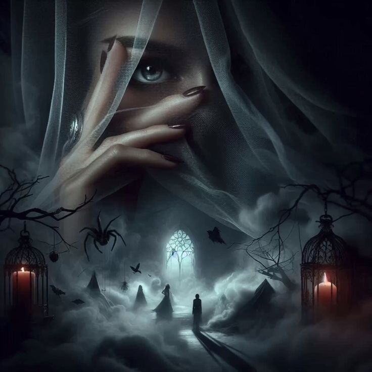 В тёмной палитре стиха и прозы перед нами разворачивается сцена, где тончайшая вуаль окутывает образ загадочной дамы, её единственный глаз пробивает вечную тьму, как свет маяка. Этот взгляд пронзает пространство, охватывая нити паутины, штрихи теней и трепетные силуэты, застигнутые в тумане. Её пальцы, будто марелевые пчёлы, изящно переплетают невидимые линии между заточёнными в клетках свечами, словно пытаются удержать магию от исчезновения. За её спиной, как призраки прошлых времён, силуэты таинственно движутся к готическому окну, омываемому лунным светом, словно в призрачном танце с судьбой. В этом готическом театре детали становятся эпосом, где паук остаётся немым хранителем тайн, а ворон кричит безмолвно о недоступности вечного.