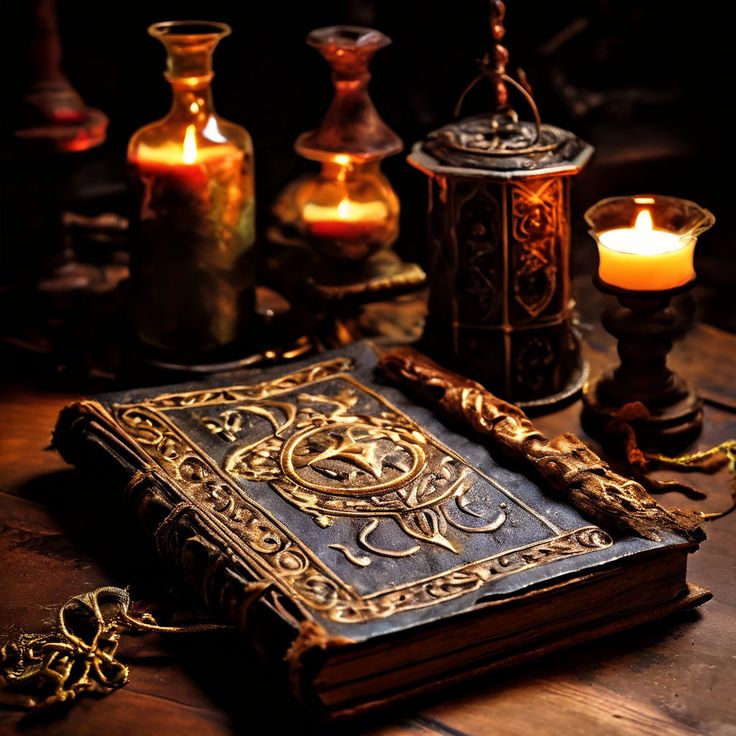 В полумраке комнаты, окунувшейся в игру теней и огоньков свечей, лежит тяжёлый том в кожаном переплёте, словно пришедший из средневековых хроник. На его обложке — золотая вязь, напоминающая алхимические символы, словно из далёкой эпохи магии и тайны. Вокруг — таинственные бутылочки, источающие ароматы забытых эликсиров. В свете кружевных узоров света и тьмы, книга кажется живой, как если бы она могла прошептать свои секреты тем, кто готов слышать. Шёпот живой истории, отражённый в резных контурах, о звуках давно погасших колоколов времени. Что таится за этими страницами? Возможно, рецепты бессмертия или древние прорицания, которые скрыты за обложкой, словно крепостной стеной. Свет свечей, колеблющийся на бронзовых поверхностях, вписывает историю в прямые и кривые линии, создавая мир, где реальность сливается с вымыслом, приглашая в мир фантазии и задумчивых раздумий.