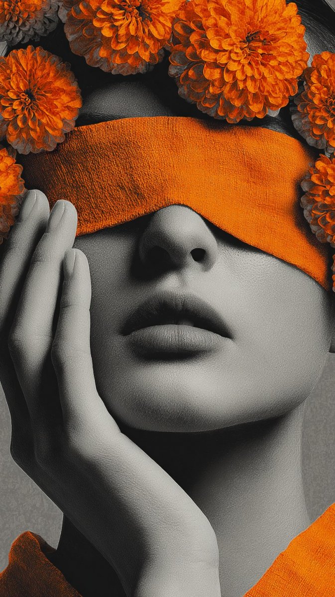 В этом визуальном калейдоскопе мраморная неподвижность лица превращается в канонический образ, где жизнь и сон переплетаются между собой, как два рассказа одного романа. Оранжевое полотно скрывает глаза, таящие загадки и мечты, словно шёпот тёплого ветерка, наполненного ароматами невидимого сада. Астральные цветы, словно чакры, венчают голову, придавая ей величавость древнегреческой статуи. Здесь, между снами и явью, между миром истин и миражей, образы рождаются как возрождение творческих энергий. Ткань нежно ложится на черты, обволакивая лицо вуалью тайны, намекающей на скрытые аспекты человеческой натуры. Это молчание, наполненное светом и тенью, где каждая складка, каждый изгиб языка цвета раскрывает свои потаённые смыслы, создавая симфонию визуальной поэзии. Говорящий шелест оранжевой ткани и лепестков олицетворяют собой единство внутреннего мира и окружающей вселенной.