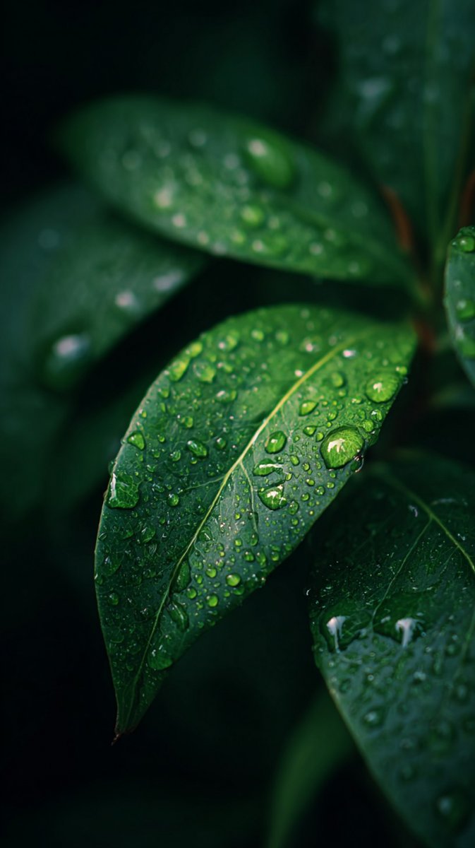 Мир просыпается после дождя, окутанный тайной и свежестью. Листья, словно мечта природы о вечной юности, переполнены росой, капли которой будто маленькие зеркала, отражающие скрытые за ними вселенные. Влага, скользящая по их поверхности, оставляет причудливые узоры, как тонкий узор судьбы, которую понимаю не каждый. Они шумят на ветру, перешептываясь друг с другом о своем листовом существовании. Густая зелень растворяется в глубине, напоминая лесные тени и шорох веков. Это не просто картина — это целый мир, где каждый атом исполнен жизни и трепета от прикосновения эфемерного дождя. Это утро дарит надежду, что за каждым зигзагом жизненного пути есть светлое продолжение.