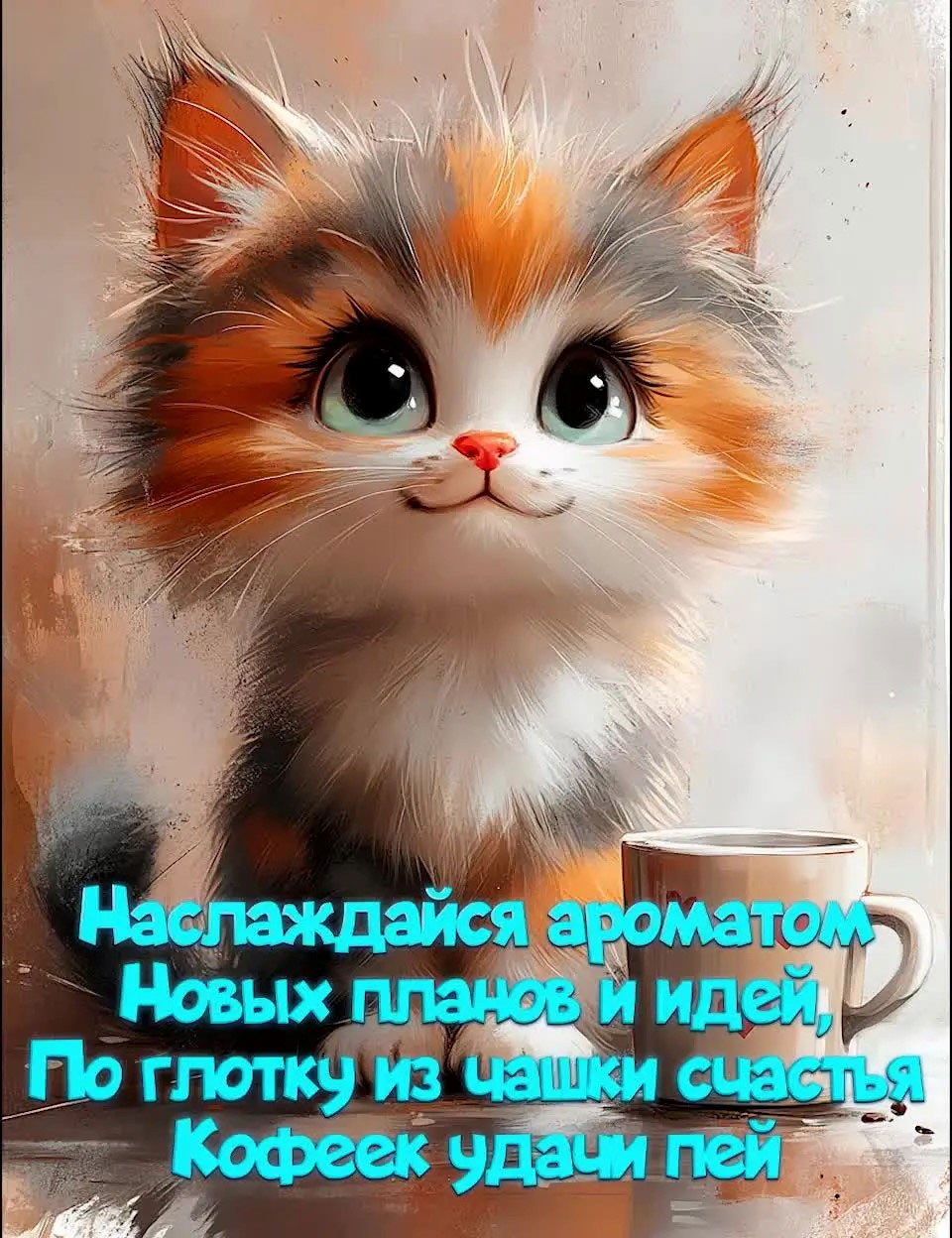 Картинка доброе утро с позитивным пожеланием про кофе, с котиком