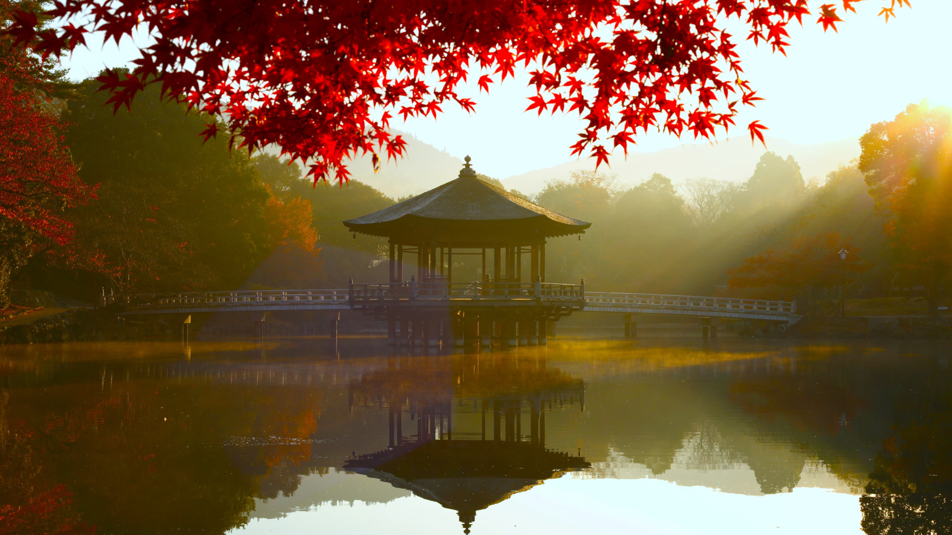 Под склоняющимся небом, где пламенеют рубиновые листья клёна, словно ожерелье из раскалённых осколков закатного солнца, уносится вдаль история древнего павильона, который отдыхает на озёрной глади, подобно старая сказка, раскрывающая свои тайны. В этот бесконечный момент времени воздух пьян от сентябрьской свежести, а вода, отражая мир, превращается в зеркало прошлого и будущего. Забытая мелодия шёпота листьев и лёгких шагов по эшафоту моста, что ведёт в неизвестность, создаёт неповторимый симфонический фон. Тайны, скрытые в тени павильона, шепчут о шелесте эпох и прикосновениях вечности. Солнце, застывшее на линии горизонта, как будто подмигивает нам, предлагая остановиться и насладиться тишиной, отзвуком мира, где каждое мгновение наполнено ароматом чая и загадок Востока.