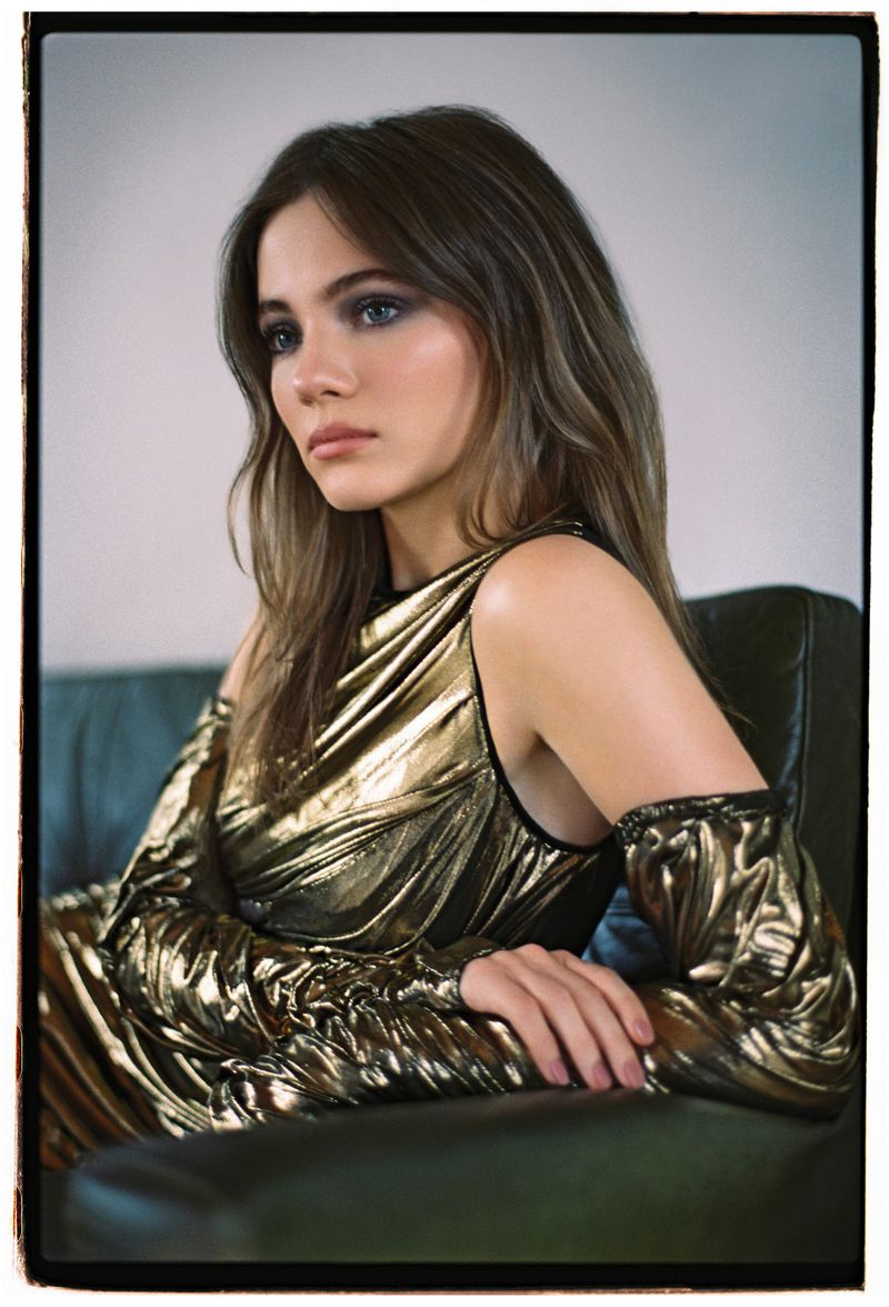 В окружении мягкого света, она сидит на кожаном диване, словно богиня, окружённая раскалёнными нитями золота. Её взгляд устремлён куда-то вдаль, за рамки обыденности, туда, где царствует безвременье, где внешний мир сдаётся её внутреннему. Блики металлической ткани её платья, струящейся по телу, как жидкое золото на древнем холсте, кажется, сочетаются с мерцанием её внутреннего света, глубоко спрятанного под спокойным выражением лица. Она – воплощение искусства, живописный портрет, бережно вписанный в пространство времени и цвета. Словно эхо минувших эпох, словно голос скрытых внутри сокровенных мыслей, её присутствие наполняет комнату богатым ароматом культуры и философии. Постила внизу — загадочная сигнатура художника, отголосок просмотренных книг и прожитых снов.
