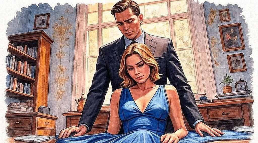 Картина словно кадр из старого фильма, где время остановилось в моменте тишины и душевного переговора. Он стоит позади, как каменное воплощение верности или тени прошлого, наблюдая за ней, склонившейся над ярко-синим платьем, растянувшимся как река сомнений. Комната, окружённая книгами и картинами, дышит историей, словно стены пропитаны воспоминаниями, шёпотом старинных страниц и дальним шумом чьих-то судеб. За окном мягкий дневной свет проникает внутрь, лаская их лица, превращая их в живую картину. Она смотрит вниз, возможно, обдумывая нечто важное или вспоминая события, неизбежно ускользающие, как песок сквозь пальцы. Пространство вокруг, наполненное кажущимся хаосом бумажных гор и забытой тишины, становится рамкой для тихой драмы. Этот момент принадлежит только им, заштрихован эмоциями, которые остаются невидимыми для глаз.
