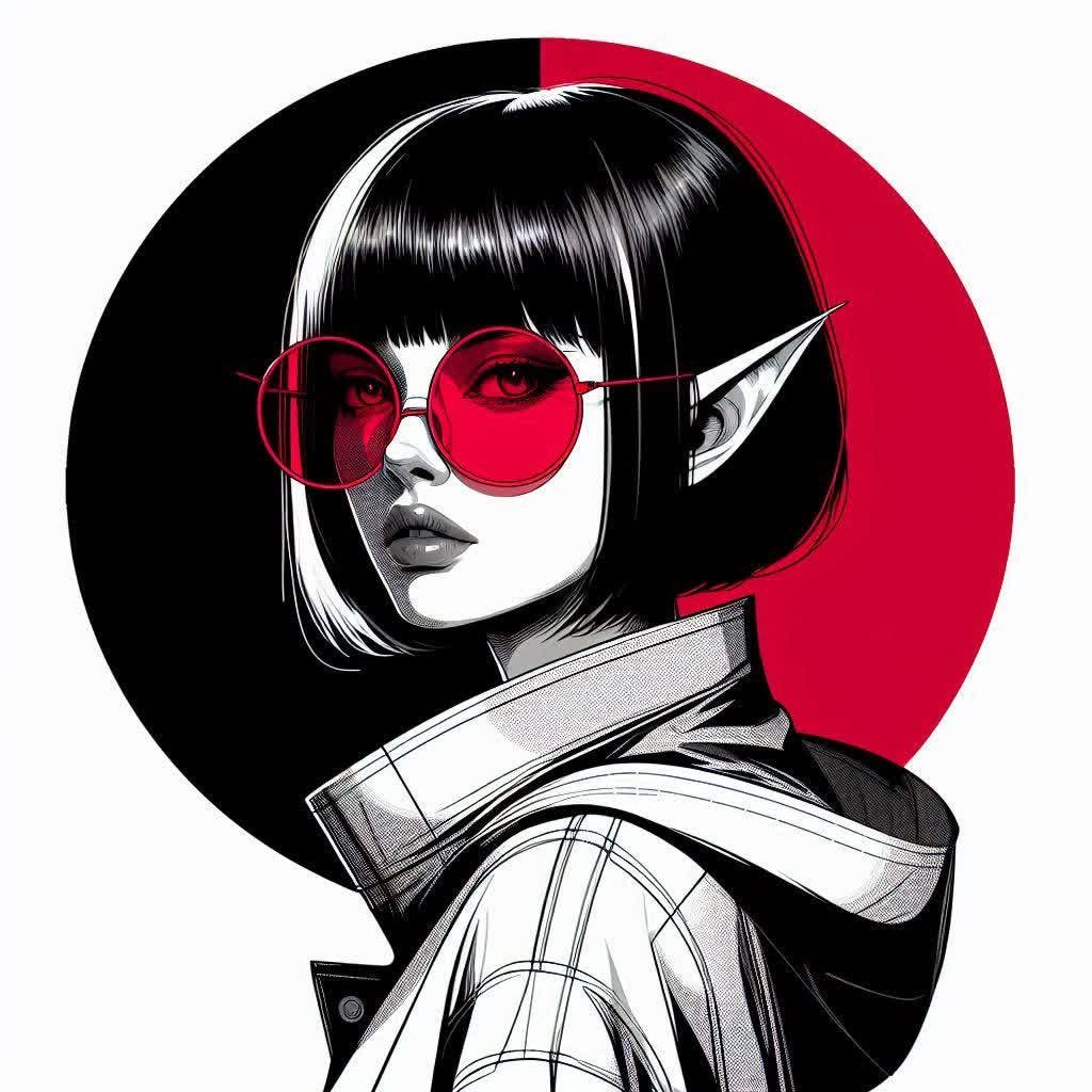 На фоне контрастного красно-черного круга, словно месть эпохи кино Нуар, она, обнаженная в своей дерзкой стилистике, восседает на границе между тенями и светом. Ее острые черты лица, подчеркнутые темными прядями, напоминают графическую произведение граффити. Алые очки, как кровавые лунные стекла, отражают что-то из далекого будущего, воплощая в себе антагонизм хрупкости и решительности. Остроконечные уши, как у эльфа из научной фантастики, добавляют ей загадочности, а каждая деталь — от четких линий пальто до тени, ложащейся на плечи, — создает образ, наполненный борьбой и непримиримой независимостью. Шепот за кадром говорит на языке контрастов, где каждый звук — это гармония искусства и протеста. Возникающее чувство, будто она знает все тайны мира, скрытые за линзами.